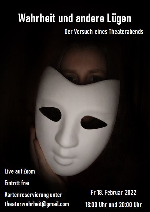 Dieser Versuch eines Theaterabends wird am 18. Februar 2022 um 18:00 Uhr sowie um 20:00 Uhr live auf Zoom stattfinden. Der Eintritt ist frei und der Veranstaltungslink wird eine halbe Stunde vor Vorstellungsbeginn per Mail verschickt (Anmeldung unter theaterwahrheit[at]gmail.com ). Sichere dir ein Ticket und begib dich mit uns in einen Gedankenstrudel über die Wahrheit im Theater.